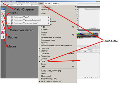 Возможно, что Слои вы не увидите. Тогда откройте Окно и выберите Слои. Это же Окно понадобится, когда мы будем переносить выделенное изображение.