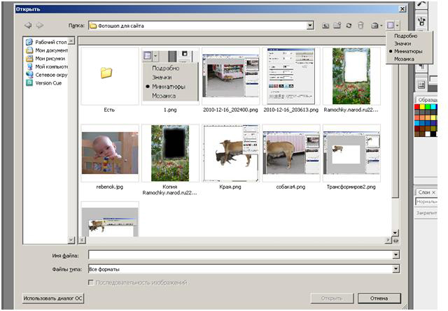 Обратите внимание на кнопку слева – Подробно-Значки-Миниатюры-Мозаика. Если выбрать Миниатюры, мы увидим картинки наших изображений. Удобно!