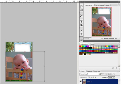 уменьшим наше изображение до примерно нужного размера.Если изображение ребенка занимает место больше, чем экран, в правом окне (навигатора) переместите ползунок и уменьшите вид. До тех пор, пока не поместятся все уголки выделения.