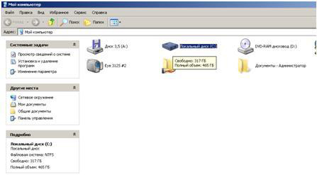 И кликнем еще раз по значку Локальный диск С. Обратите внимание – слева внизу появилась информация Свободно 317 Гб и Полный объем 465 Гб. Если у вас есть два диска – С и D – достаточно проверить диск D, потому что информация хранится на нем. Диск С служит для служебных файлов.